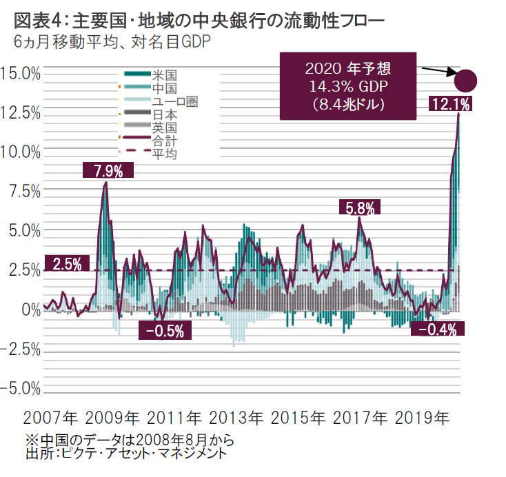 各国で経済封鎖が解除されており、世界の製造業 PMIは足下で急反発しています。また生産・受注状況も多くの国で改善傾向を示しており、経済の回復基調が強まっています。世界の主要5カ国・地域の中央銀行の信用供給は8.4兆ドル(同国・地域のGDPの14.3%)に達すると見られ、引き続き株式市場を下支えしています(図表4参照)。特筆すべきは、米連邦準備制度理事会(FRB)の量的緩和の金融市場への波及速度がリーマン危機時よりも速い点で、過去の経験則が通用しづらい状況です。
