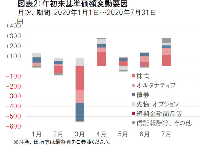 また、大きな損失を被ったグローバルヘッジファンドインデックスとは対照的に、オルタナティブ資産のなかの東証REIT(ETF)を除いたポジションのマイナス寄与は2月と3月には相対的に低位に留まり耐性を示しました。