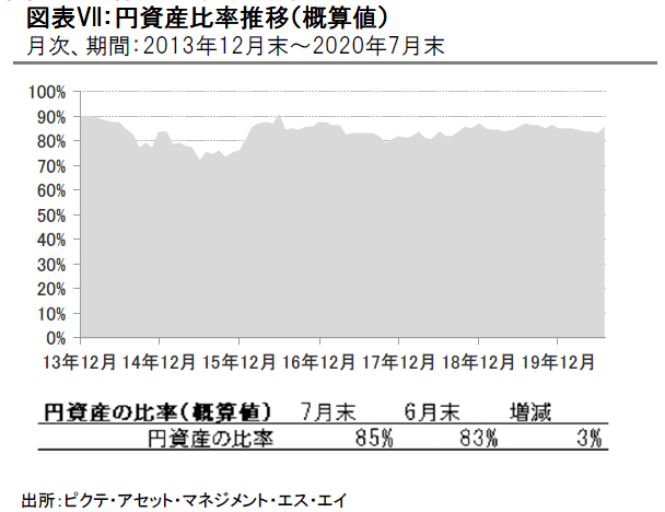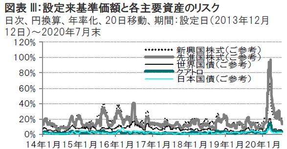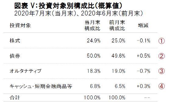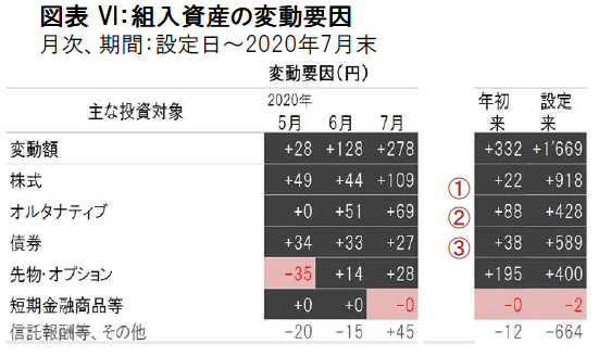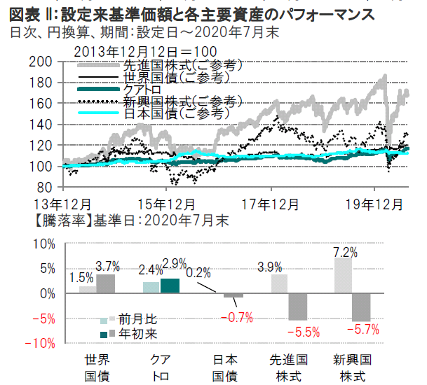 クアトロの2020年7月31日の基準価額は、前月末比で +278円(+2.44%)の11,669円となりました。 (図表I参照)2020年7月の基準価額変動要因の内訳は、株式+109円、債券+27円、オルタナティブ+69円、先物・オプション+28円などとなりました。