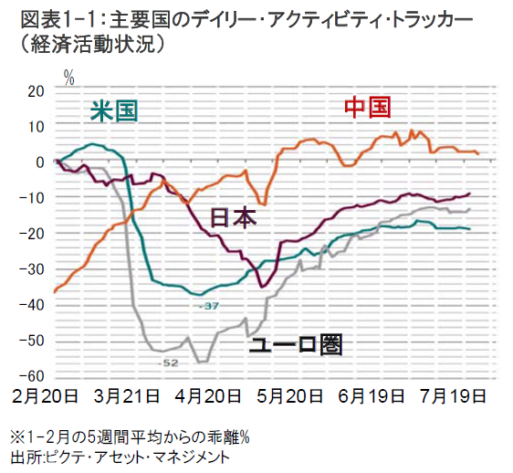 一方、クレジットカードの使用や交通量の状況等、日常の経済活動を測る指標(「デイリー・アクティビティ・トラッカー」)は恐らく、新規感染者の増加を受けて、世界の経済活動の改善は限定的なものに留まっているということを示唆しています(図表1-1参照)。