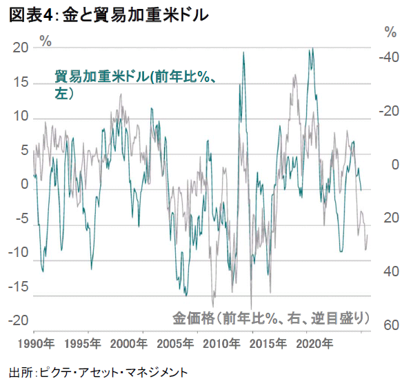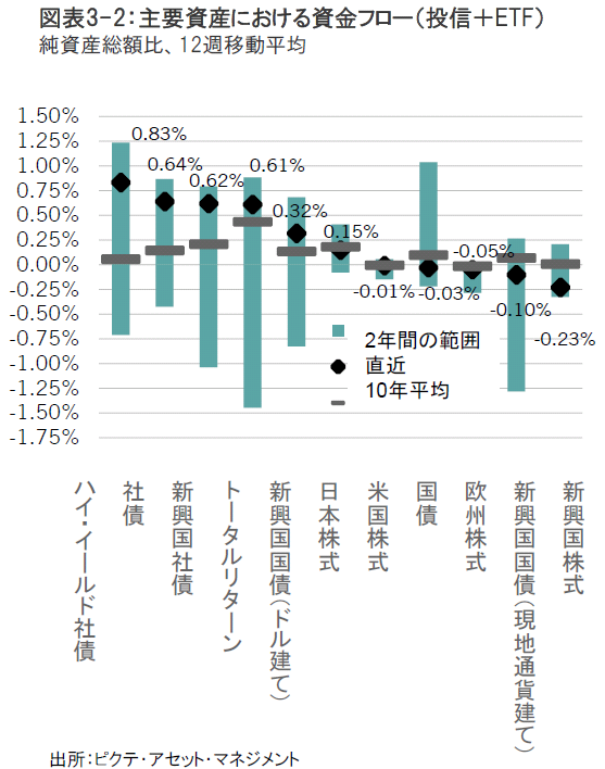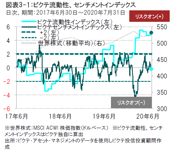 ピクテのテクニカル指標から、金の急騰ぶりに対して投機筋の買いが比較的低位に留まっている状況が示唆されることは先行きを期待させます。投資家心理を表す指標は、株式をニュートラルとするピクテの見方を支持する一方で、社債の上昇相場の一服を示唆しています。(図表3-1参照)