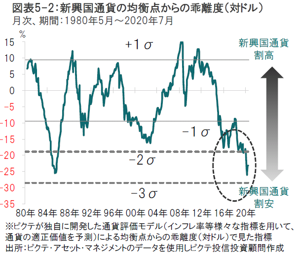 新興国通貨は、景気先行指数は新興国のほうが先進国よりも状態が良く、バリュエーションの観点からも魅力的です。ピクテのバリュエーション指標は、新興国通貨が購買力平価ベースで20数年ぶりの割安水準にあることを示唆しています。