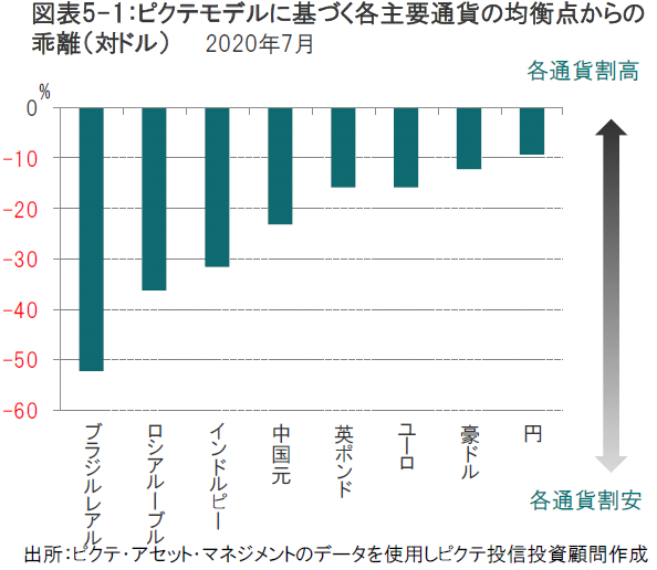 ドルに対するピクテの見方は、債券の組入れの正当性を説明しています。先進国債券の利回りが超低位に張り付き、新興国通貨の割安感が解消されないことから、現地通貨建て新興国債券のオーバーウェイトの度合いを債券セクター中、最も高くしています。新興国通貨は、弊社のモデルで測定すると、過去20年超で最も割安な水準に留まります。
