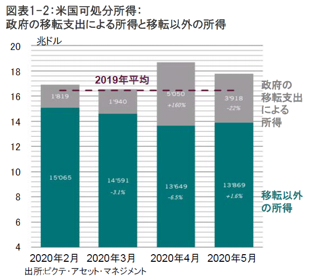 各国が公約した金融ならびに財政刺激は、総じて見れば、新型コロナウイルスのパンデミックに関連した不透明感を払拭するのに十分だと考えます。米国の場合、政府の移転支出は、家計の総所得の約4分の1前後と、新型コロナウイルス発生前の2倍を超える水準に達しています。正常な所得源(である雇用)が回復しない場合は将来大きな問題につながる可能性があるものの、当面のところは、経済および市場のサポート要因になっていると考えます(図表1-2参照)。