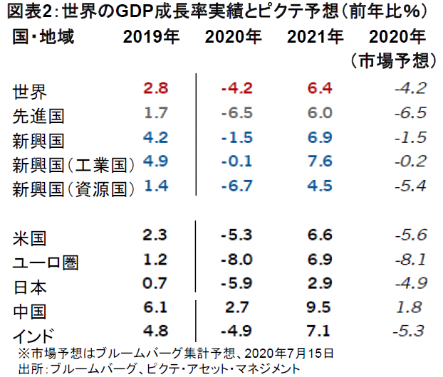 経済であれ、政局であれ、新型コロナウイルスの感染拡大状況のいずれの観点からも、欧州市場は、米国市場と比較して魅力的だと考え、欧州株式のオーバーウェイトを維持しています。独仏両国が主導した総額7,500億ユーロの「欧州復興基金」の創設にEU加盟国が合意したことに加えて、欧州中央銀行(ECB)が景気刺激策を継続していることから、域内経済は従来以上に堅固な基盤の上に置かれています。従って、2021年のユーロ圏実質GDP成長率予想を約1%上方修正し、約7%としました(図表2参照)。