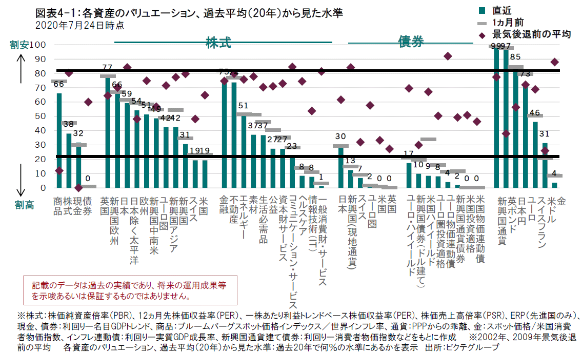 4)バリュエーション(相対的価値分析)~債券は、株式よりも更に割高で、バリュエーションは過去20年でもっとも割高な水準
