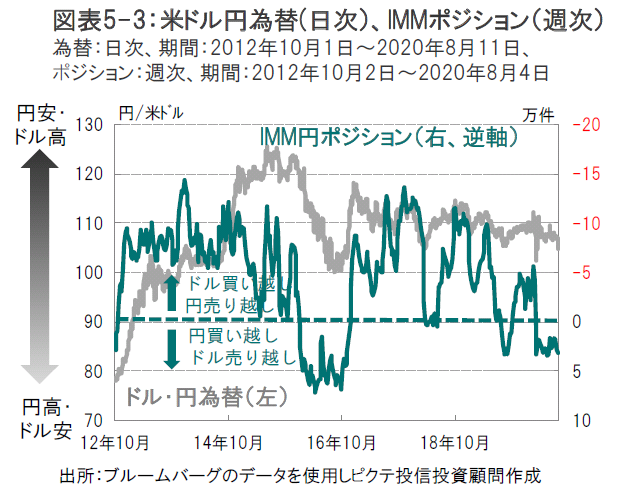 ただし、足元ではドル売り・円買いのボジションが積みあがり(図表5-3参照)、決済通貨としてのドル需要逼迫とのバランスから、短期的にはドルはこのボジションが解消するまでは底固いと見ています。 (図表5-1~5-3参照)