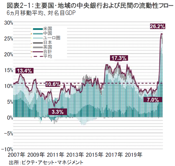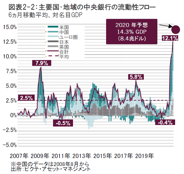流動性は、引き続き、極めて潤沢で、ピクテのモデルは主要国の全てに最も高いスコア(++)を付けています。日本は、政府保証付きの新型コロナウイルス対策融資の急増を受けて、他の主要先進国と政策面で足並みをそろえています。世界の主要中銀5行は、年間(2020年予想)を通じて、GDP(国内総生産)比で約14%に相当する流動性を供給するものと見られますが、これは、2008年の世界金融危機後に供給された流動性のほぼ2倍に相当します(図表2-2参照) 。一方、足元の供給のペースには陰りが見られることから、世界の金融緩和局面がピークを付けるのは遠い先のことではなく、今四半期中の可能性もあると見ています。弊社の分析が示唆しているのは、市場が、米連邦準備制度理事会(FRB)による正式なイールドカーブ・コントロールを含んだ年内の流動性創出の工程を全て織り込んでいるということです。