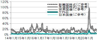 日次、円換算、年率化、20日移動、期間:設定日(2013年12月12日)~2020年10月末
