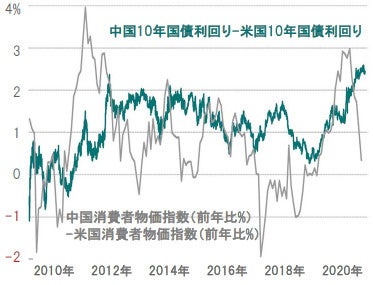図表4:米中10年国債利回り差と物価上昇率差