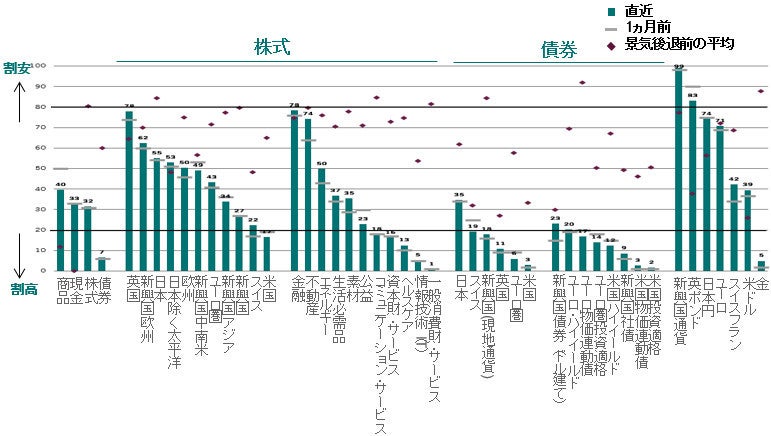 図表4-1:各資産のバリュエーション、過去平均(20年)から見た水準