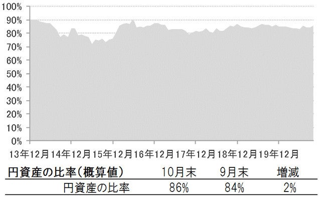 ※円資産の比率は、当ファンドで保有しているコール・ローン等の比率と、円建て資産の比率、為替予約の比率から計算した概算値です。円建て資産の比率は、各投資先ファンドで組入れている円建て資産と各投資先ファンドの実質組入比率から算出しています。為替予約の比率は、当ファンドで直接行う為替予約の比率です。