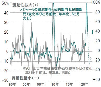 図表2-2:メジャー5 –の総流動性変化率と世界株式のバリュエーション変化