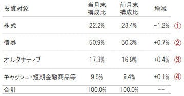 ※投資対象別構成比は、マザーファンドの各投資先ファンドを主な投資対象によって分類し、債券・株式・コモディティ・オルタナティブ・先物、キャッシュ・短期金融商品等と表示しています。「キャッシュ・短期金融商品等」には、投資先ファンドで保有する現金等の比率は含みません。※構成比は実質比率(マザーファンドの組入比率×マザーファンドにおける当該資産の組入比率)です。構成比は四捨五入して表示しているため、それを用いて計算すると誤差が生じる場合があります。