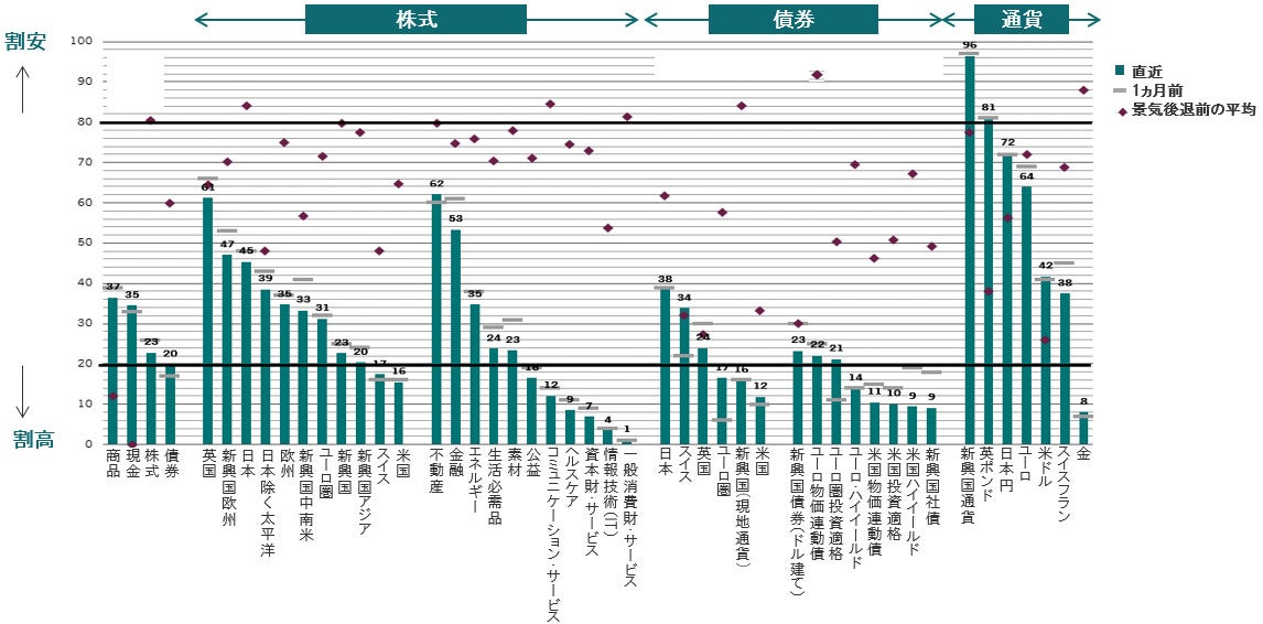 ※株式:株価純資産倍率(PBR)、12ヵ月先株価収益率(PER)、一株あたり利益トレンドベース株価収益率(PER)、株価売上高倍率(PSR)、ERP(先進国のみ)、現金、債券:利回りー名目GDPトレンド、商品:ブルームバーグスポット価格インデックス/世界インフレ率、通貨:PPPからの乖離、金:スポット価格/米国消費者物価指数、インフレ連動債:利回りー実質GDP成長率、新興国通貨建て債券:利回りー消費者物価指数などをもとに作成 ※2002年、2009年景気後退前の平均 各資産のバリュエーション、過去平均(20年)から見た水準:過去20年で何%の水準にあるかを表示