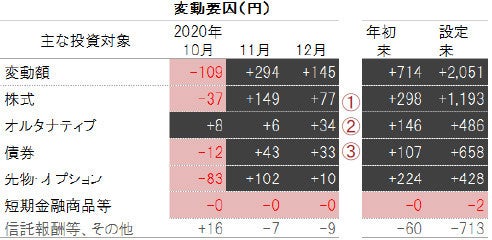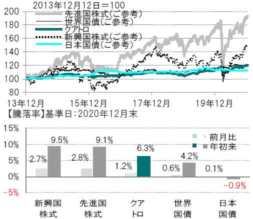 クアトロの2020年12月30日の基準価額は、前月末比で +145円(+1.22%)の12,051円となりました。 (図表I参照)。2020年12月の基準価額変動要因の内訳は、株式+77円、債券+33円、オルタナティブ+34円、先物・オプション+10円などとなりました。