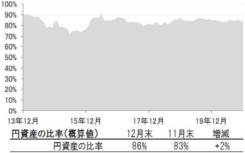 ※円資産の比率は、当ファンドで保有しているコール・ローン等の比率と、円建て資産の比率、為替予約の比率から計算した概算値です。円建て資産の比率は、各投資先ファンドで組入れている円建て資産と各投資先ファンドの実質組入比率から算出しています。為替予約の比率は、当ファンドで直接行う為替予約の比率です。出所:ピクテ・アセット・マネジメント