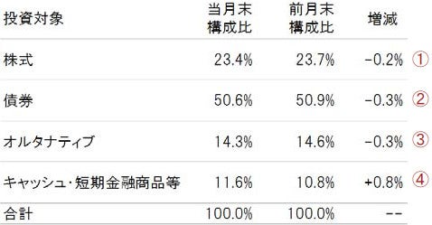 ※投資対象別構成比は、マザーファンドの各投資先ファンドを主な投資対象によって分類し、債券・株式・コモディティ・オルタナティブ・先物、キャッシュ・短期金融商品等と表示しています。「キャッシュ・短期金融商品等」には、投資先ファンドで保有する現金等の比率は含みません。※構成比は実質比率(マザーファンドの組入比率×マザーファンドにおける当該資産の組入比率)です。構成比は四捨五入して表示しているため、それを用いて計算すると誤差が生じる場合があります。