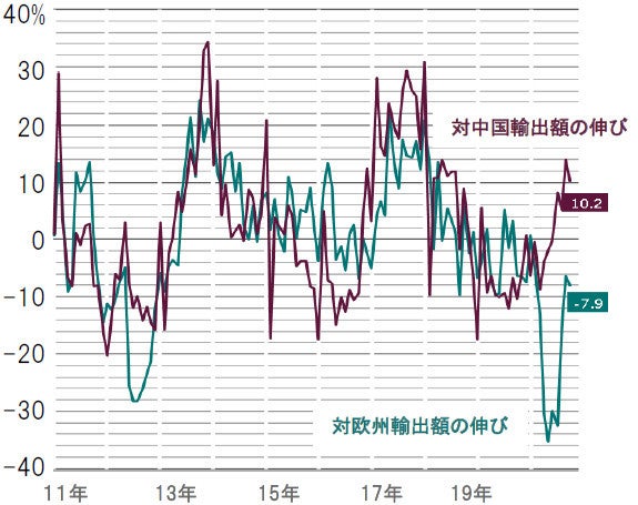 図表2:日本の輸出額の伸び(対中国及び対欧州)
