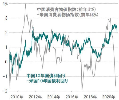 マイナス利回りで取引されているグローバル債券の時価総額は約18兆ドルと過去最高を更新し、米国を除く世界の全ての国のGDPの規模を上回っています。こうしたなかで、新興国債券全般、とりわけ中国国債が、プラスの実質利回りの源泉として傑出しています。直近の経済統計から確認されるのは、中国経済が極めて堅調だということです。全ての産業セクターがコロナ禍前の活動の水準を回復し、(世界貿易に占める中国貿易の比率は過去最高水準に達するなど)輸出が急増する一方で、インフレは抑制されています。加えて、中国10年国債の米国10年国債に対するスプレッドは過去最高水準に達していることから、人民元建て債券に対して強気な姿勢を維持しています。