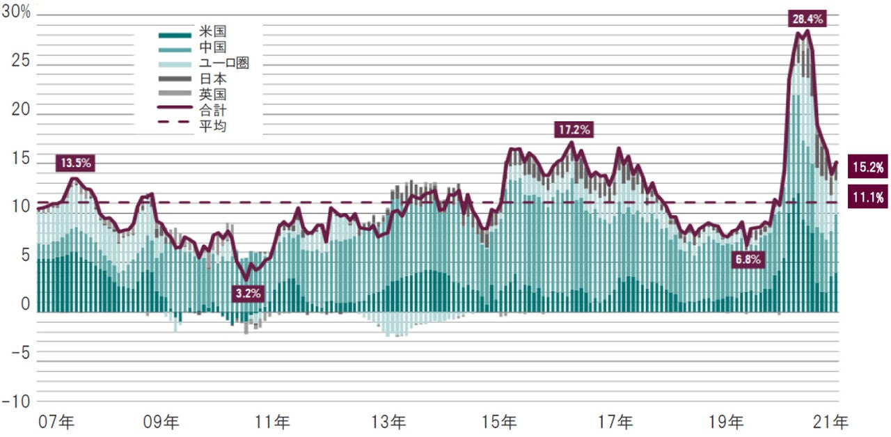 ピクテの景気循環指数は、米国の力強い景気回復を受け、グローバル経済の回復にも弾みが付きつつあることを示唆しています。また、力強い経済成長はインフレ圧力を強めることが予想されますが、物価の上昇は緩やかなものに留まるものと思われます。また、中国経済は、力強く回復を続けており、2021年の実質GDP成長率予想を1%上方修正し、10.5%としています。