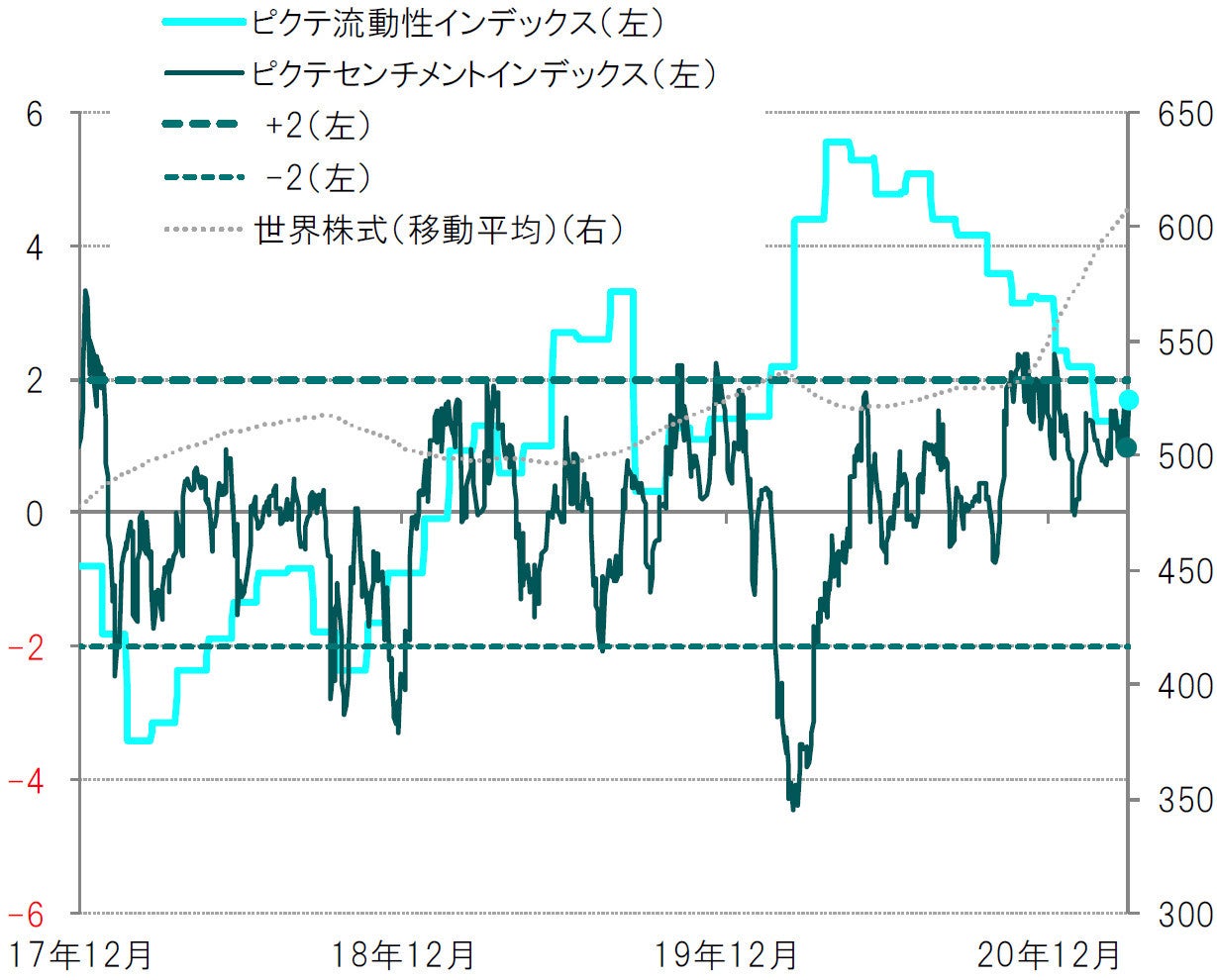 ※世界株式:MSCI ACWI 株価指数(ドルベース) ※ピクテ流動性、センチメントインデックスは流動性供給量や世界株式の予想PER等を使用し、ピクテ独自に算出