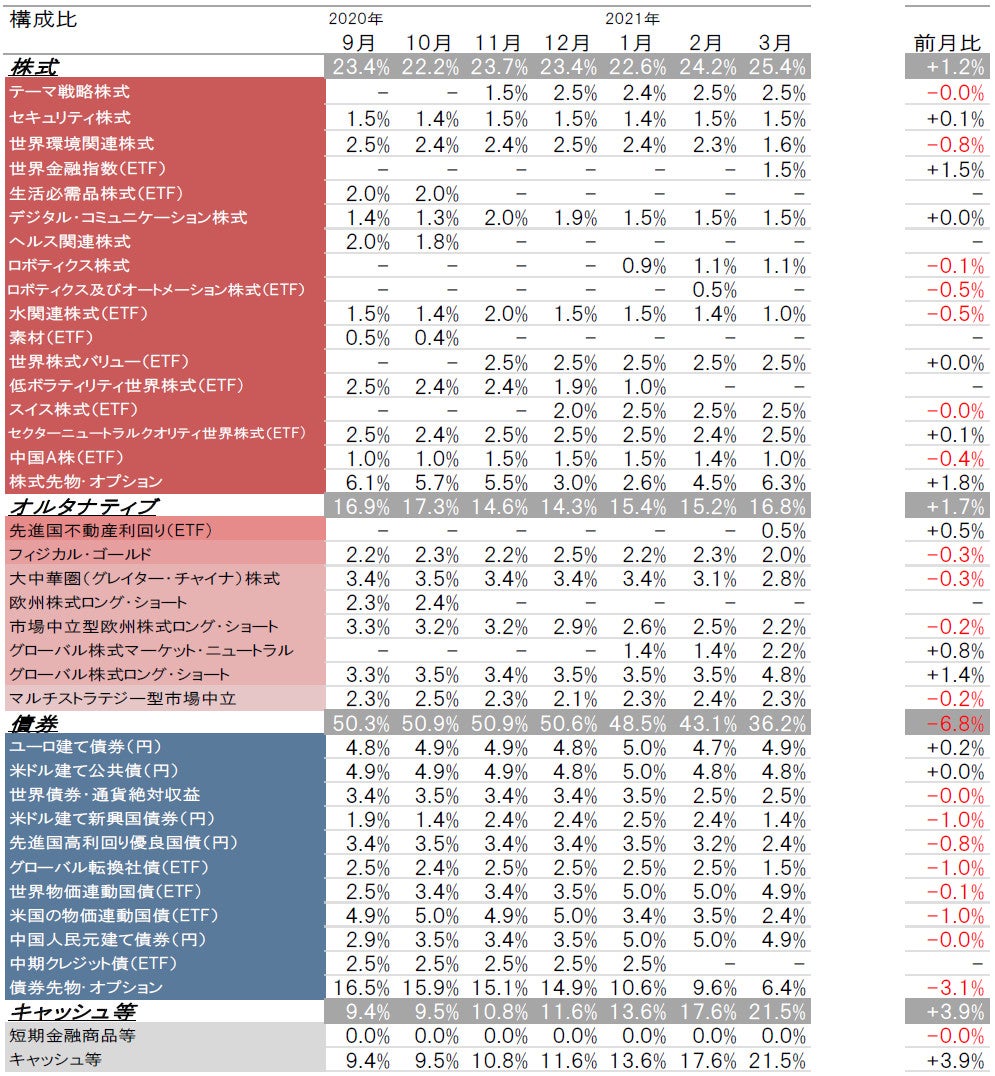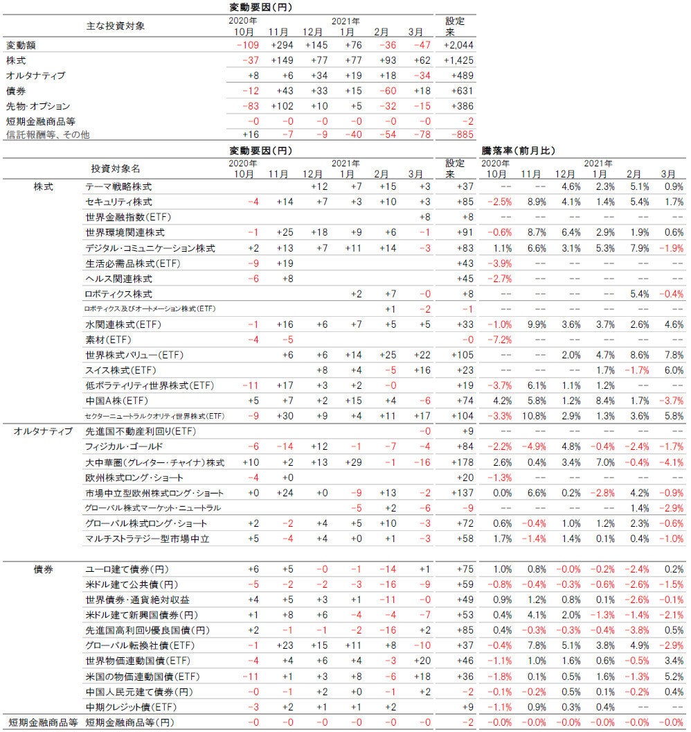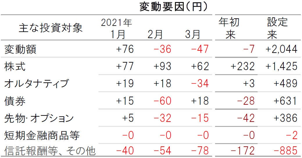 2021年3月の基準価額変動要因は、株式や債券がプラス要因となった一方で、オルタナティブや先物・オプションがマイナス要因となりました。