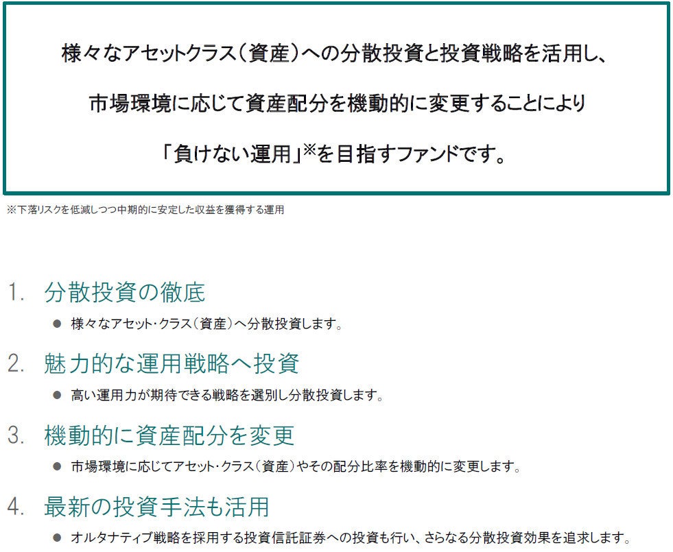 ●投資信託は、値動きのある有価証券等(外貨建資産に投資する場合は、為替変動リスクもあります)に投資いたしますので、基準価額は変動します。したがって、投資者の皆さまの投資元本が保証されているものではなく、基準価額の下落により、損失を被り、投資元本を割り込むことがあります。
