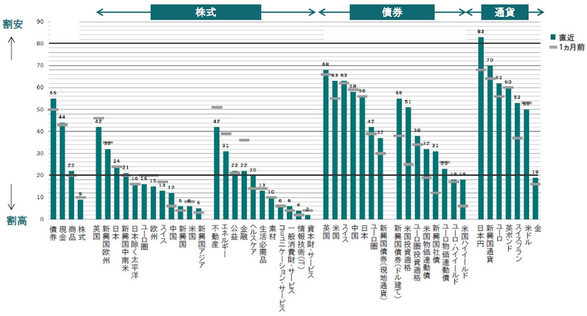 ※株式:株価純資産倍率(PBR)、12ヵ月先株価収益率(PER)、一株あたり利益トレンドベース株価収益率(PER)、株価売上高倍率(PSR)、ERP(先進国のみ) 現金および債券:利回りー名目GDPトレンド 商品:ブルームバーグスポット価格インデックス/世界インフレ率 通貨:PPPからのかい離 金:スポット価格/米国消費者物価指数 価連動債:利回りー実質GDP成長率 現地通貨建て新興国債券:利回りー消費者物価指数などをもとに算出。