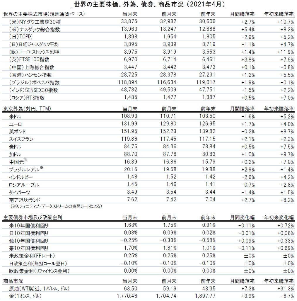 米中を中心に世界経済の回復局面が続く一方、投入コストの上昇を背景とする物価上昇圧力の高まりや、米バイデン政権による増税方針など、株式に調整圧力が強まる要因も散見されます。