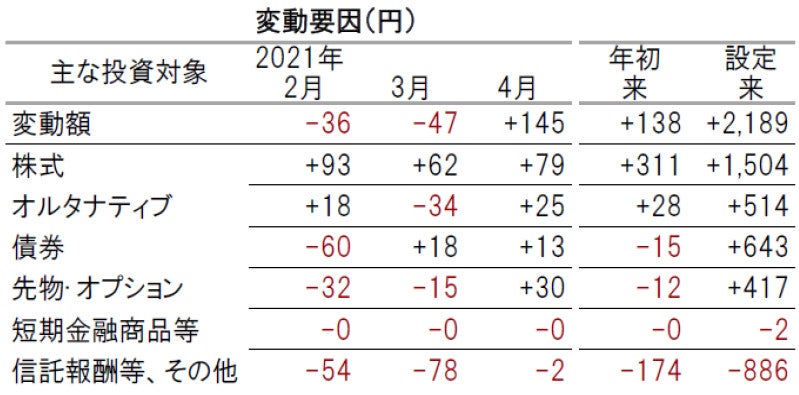 2021年4月の基準価額変動要因は、株式、オルタナティブ、債券や先物・オプションが総じてプラス要因となりました。