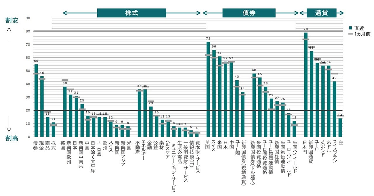 ※株式:株価純資産倍率(PBR)、12ヵ月先株価収益率(PER)、一株あたり利益トレンドベース株価収益率(PER)、株価売上高倍率(PSR)、ERP(先進国のみ) 現金および債券:利回りー名目GDPトレンド 商品:ブルームバーグスポット価格インデックス/世界インフレ率 通貨:PPPからのかい離 金:スポット価格/米国消費者物価指数 物価連動債:物価連動債利回りー実質GDP成長率 現地通貨建て新興国債券:利回りー消費者物価指数などをもとに算出。