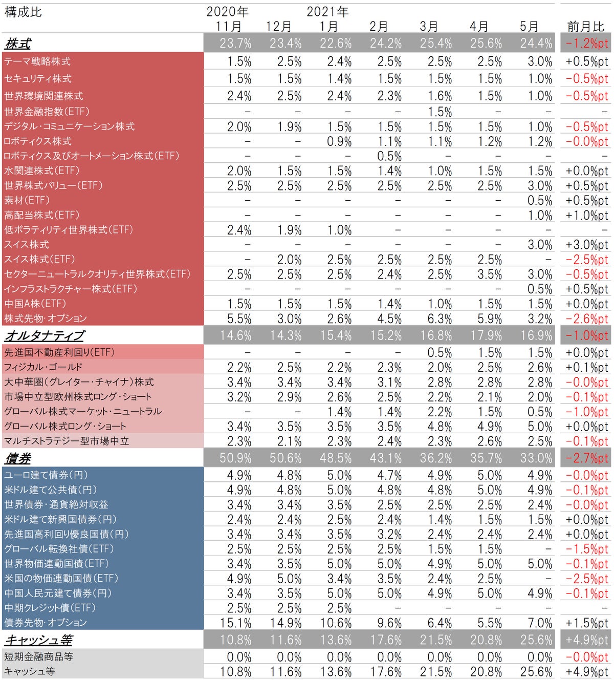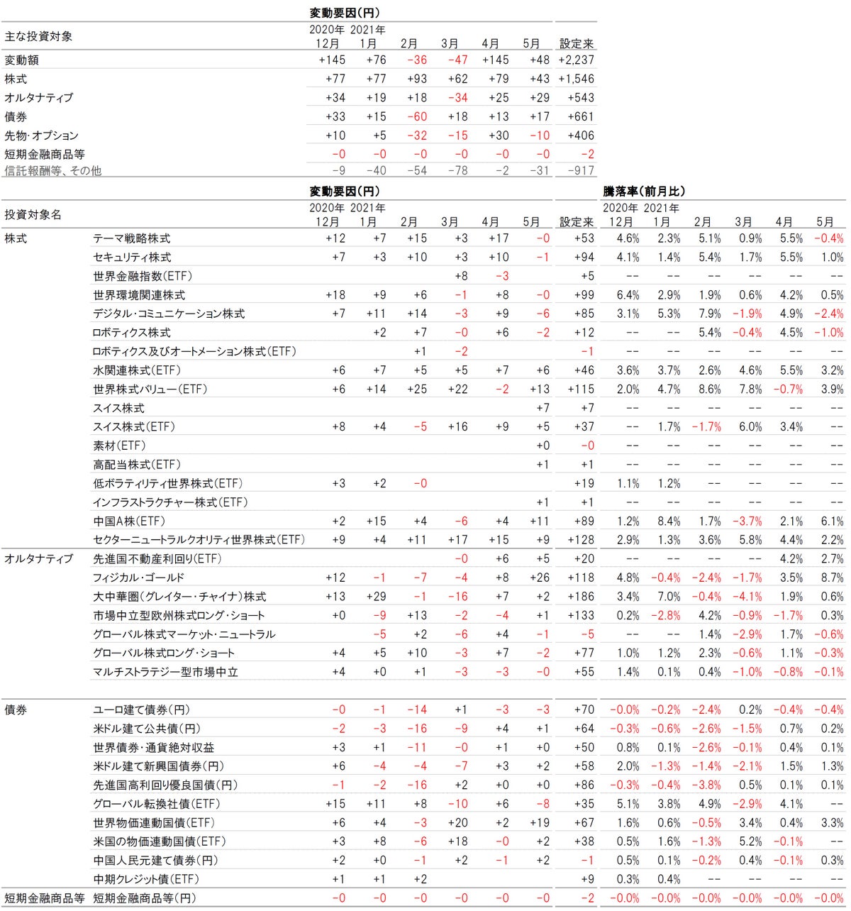※外貨建ての指定投資信託証券は円換算して騰落率を計算しています(為替レート:対顧客電信売買相場の仲値)。騰落率は分配金を再投資して計算し、各月末に組入れがある投資信託証券について直近の組入開始日から各月末までの期間の月次の騰落率を表示しています。売買により一旦組入れがなくなった後に再び組入れを開始した場合は、再び組入れる前の期間については騰落率は表示されません。変動要因の各資産の数値は2020年12月末~2021年5月末に保有の資産の表示しているため、資産クラス別の設定来の合計値は各資産の設定来の変動要因と必ずしも一致しません。マザーファンドの投資先ファンドであるピクテ・デルタ・ファンドの変動要因は主な投資対象の先物・オプションに含まれます。※出所、注釈等は最終頁もご参照ください。