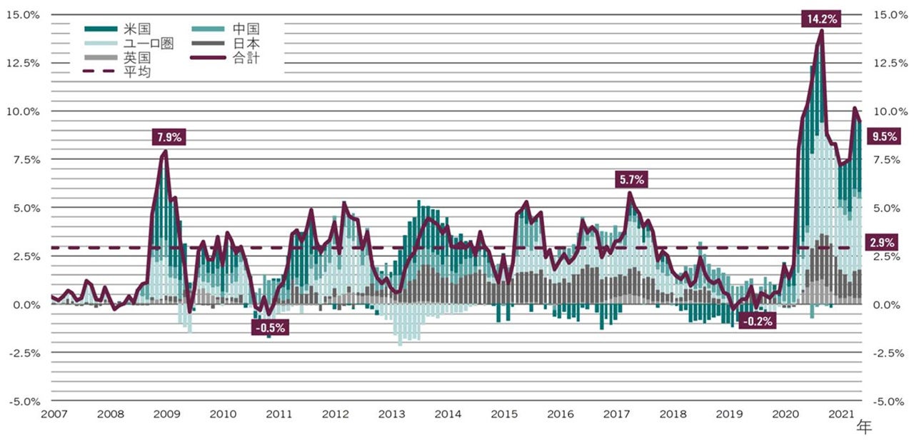 ピクテの流動性指標は、中央銀行による流動性供給が、引き続き、リスク性資産の支援要因となる状況を示唆しています。図表4は主要国・地域の中央銀行の流動性フロー(6ヵ月移動平均、対名目GDP)の推移を示したもので、コロナ・ショック以降の各中央銀行の積極的な流動性供給が過去の平均的な水準を大きく上回り、各種資産クラスの価格形成に大きな追い風となっていることを示しています。
