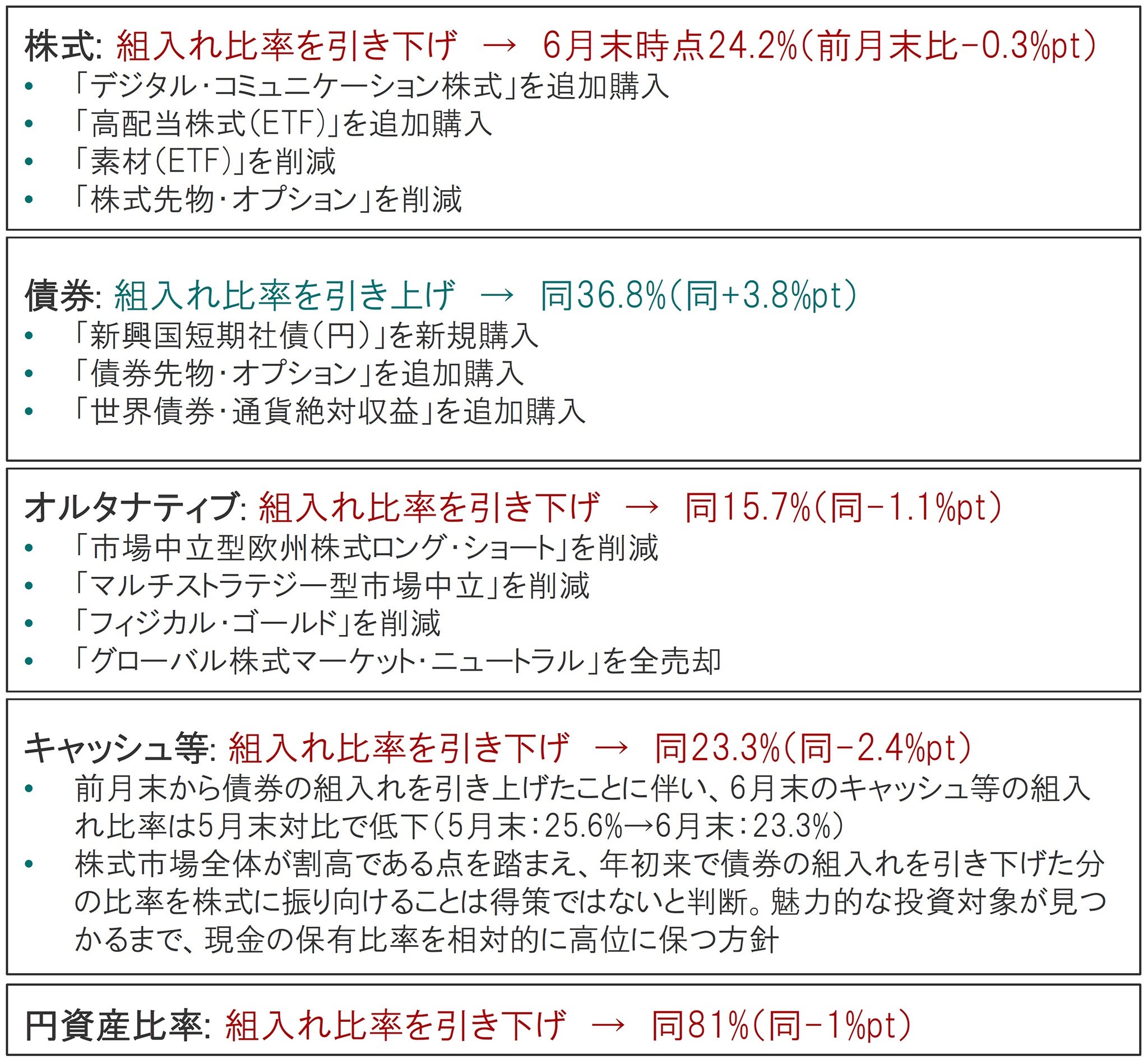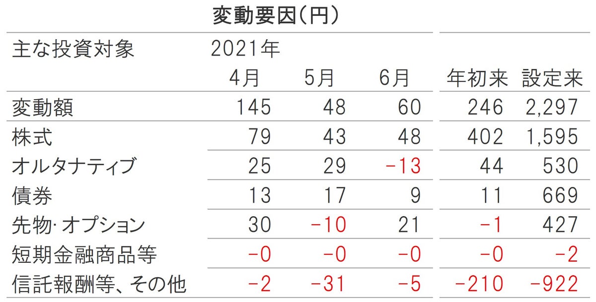 2021年6月の基準価額変動要因は、株式、債券、先物・オプションがプラス要因となった一方で、オルタナティブがマイナス要因となりました。
