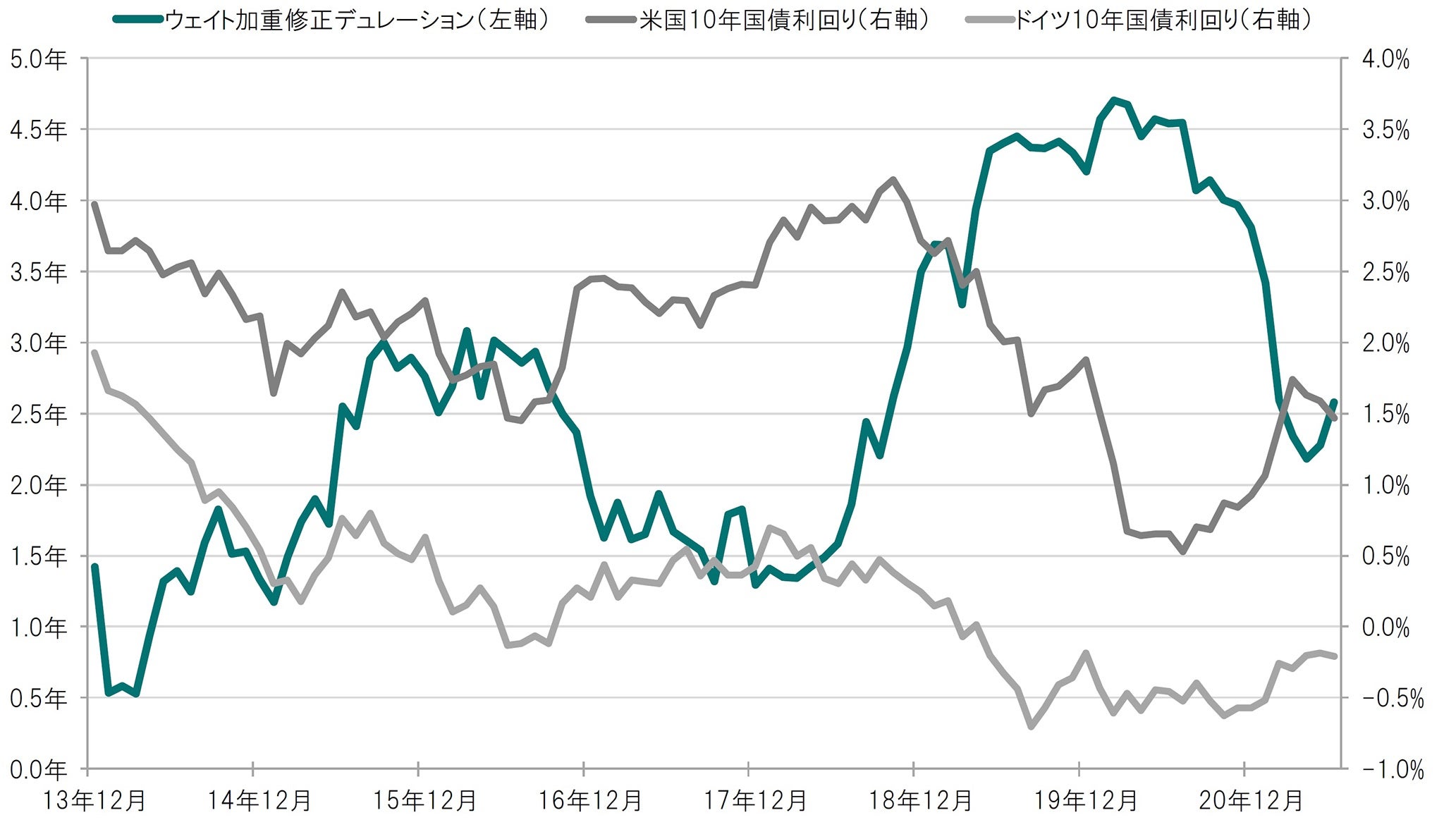 ご参考図表の緑の線で示したのはクアトロの「ウェイト加重修正デュレーション」(以下、デュレーション)で、クアトロの運用パフォーマンスの金利変動に対する感応度を表します。デュレーションは金利の動向に合わせて常に調整する必要があり、例えば、金利上昇(債券価格下落)圧力が強い局面では、デュレーションを短縮するといった調整を行います。