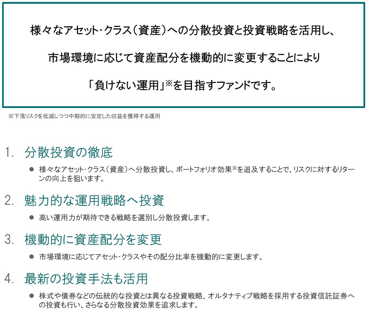 ※「ポートフォリオ効果」とは、値動きの異なる複数の資産を組み合わせて分散投資をすることで、個々の資産の値動きが相殺され、ポートフォリオ全体としてのリスクが軽減されることをいいます。