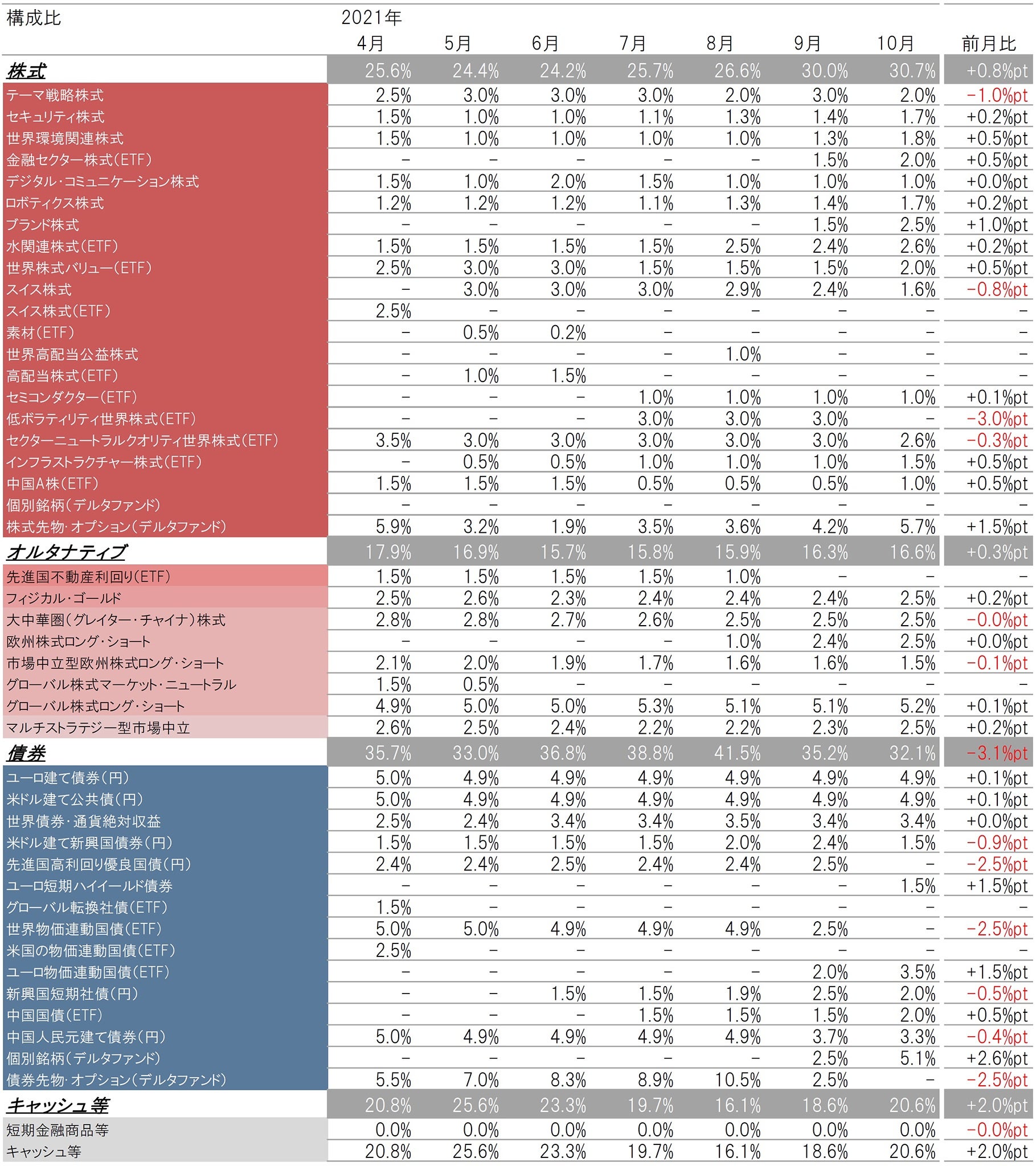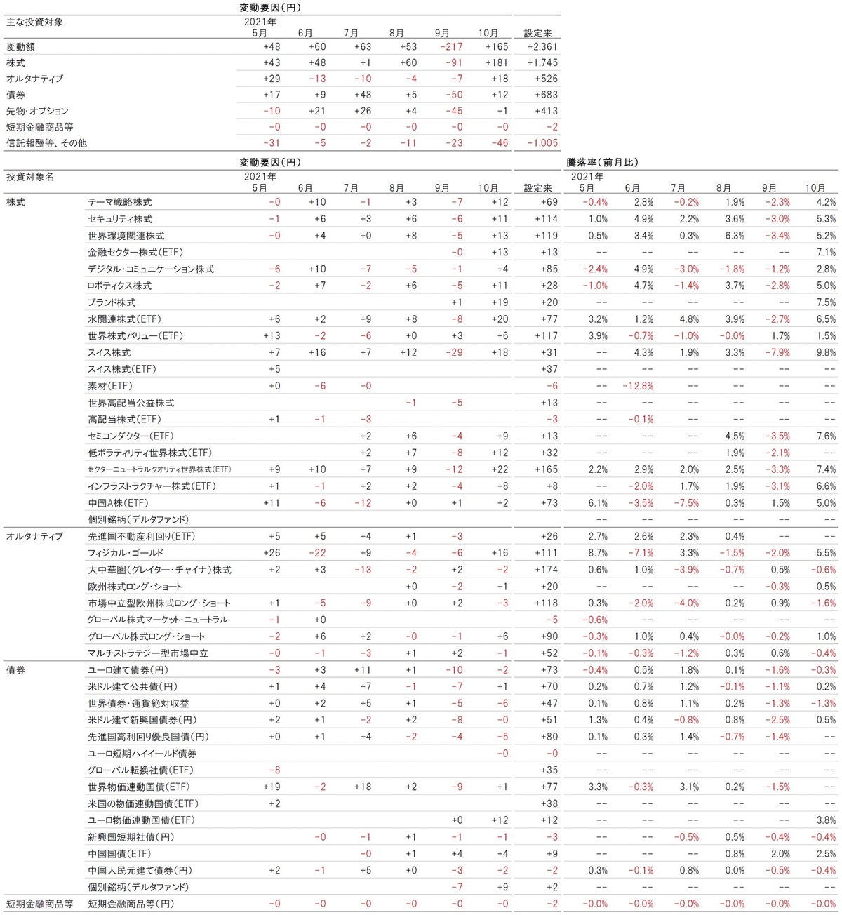 ※外貨建ての指定投資信託証券は円換算して騰落率を計算しています(為替レート:対顧客電信売買相場の仲値)。騰落率は分配金を再投資して計算し、各月末に組入れがある投資信託証券について直近の組入開始日から各月末までの期間の月次の騰落率を表示しています。売買により一旦組入れがなくなった後に再び組入れを開始した場合は、再び組入れる前の期間については騰落率は表示されません。変動要因の各資産の数値は2021年5月末~2021年10月末に保有の資産の表示しているため、資産クラス別の設定来の合計値は各資産の設定来の変動要因と必ずしも一致しません。マザーファンドの投資先ファンドであるピクテ・デルタ・ファンドの変動要因は主な投資対象の先物・オプションに含まれます。