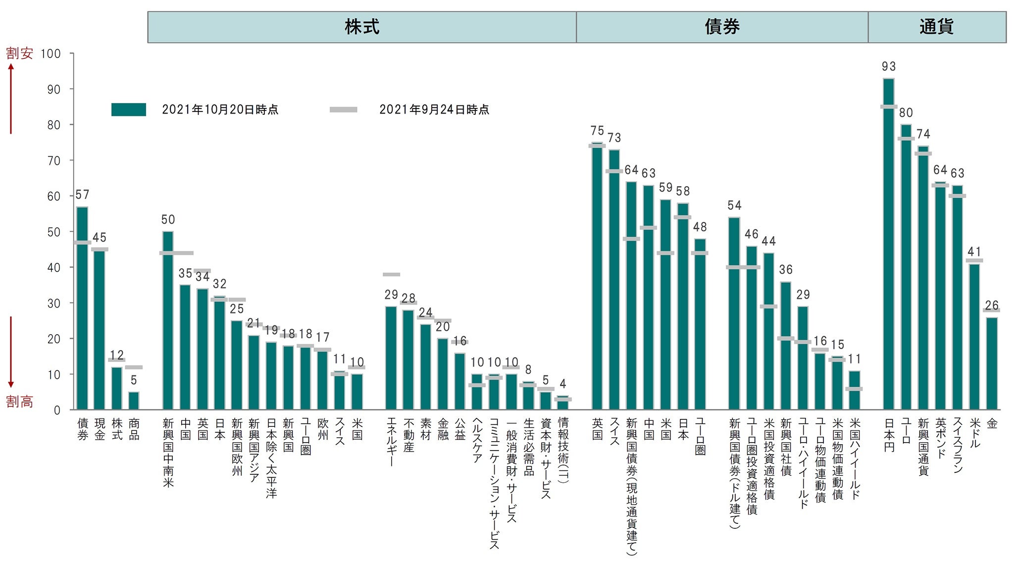 ※株式:株価純資産倍率(PBR)、12ヵ月先株価収益率(PER)、一株あたり利益トレンドベース株価収益率(PER)、株価売上高倍率(PSR)、PEGレシオ、株式リスクプレミアム(先進国のみ) 現金および債券:利回りー名目GDPトレンド 商品:ブルームバーグスポット価格インデックス/世界インフレ率 通貨:PPP(購買力平価)からのかい離 金:スポット価格/米国消費者物価指数 物価連動債:物価連動債利回りー実質GDP成長率 現地通貨建て新興国債券:利回りー消費者物価指数などをもとに算出。