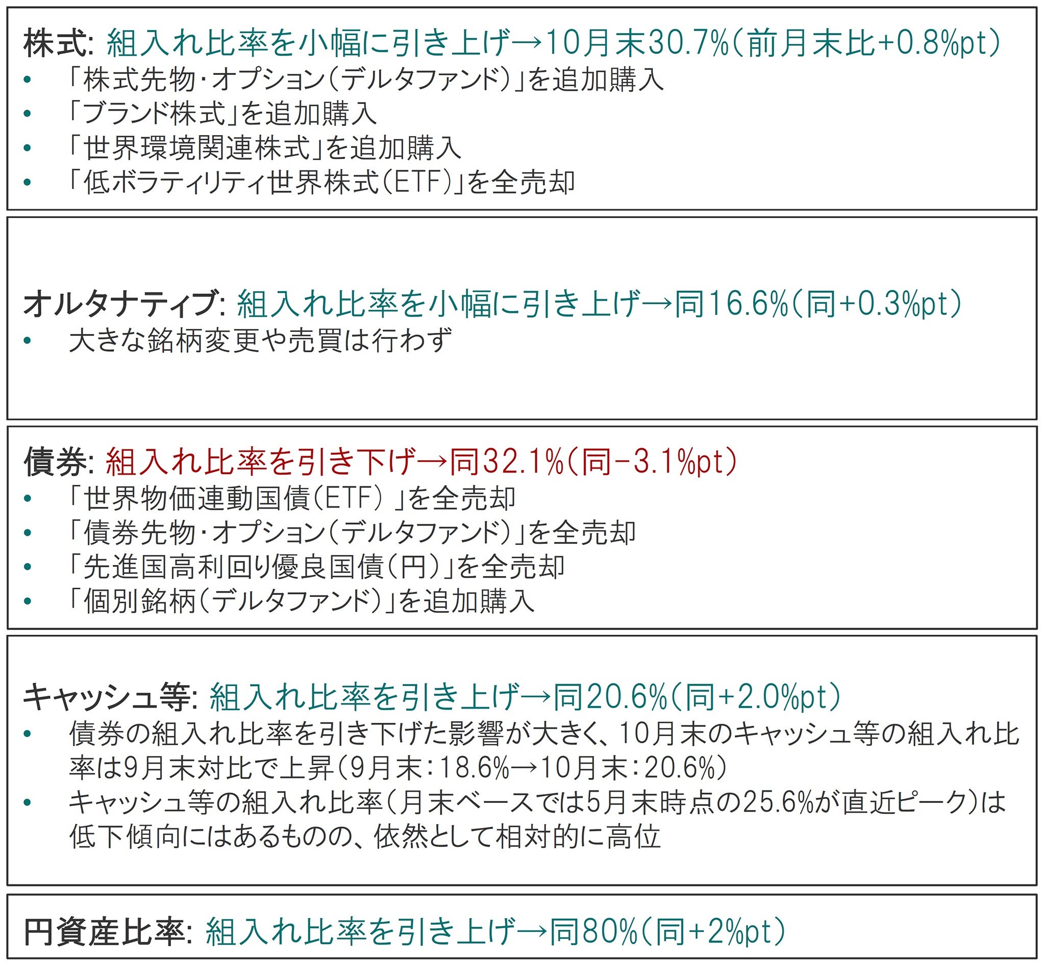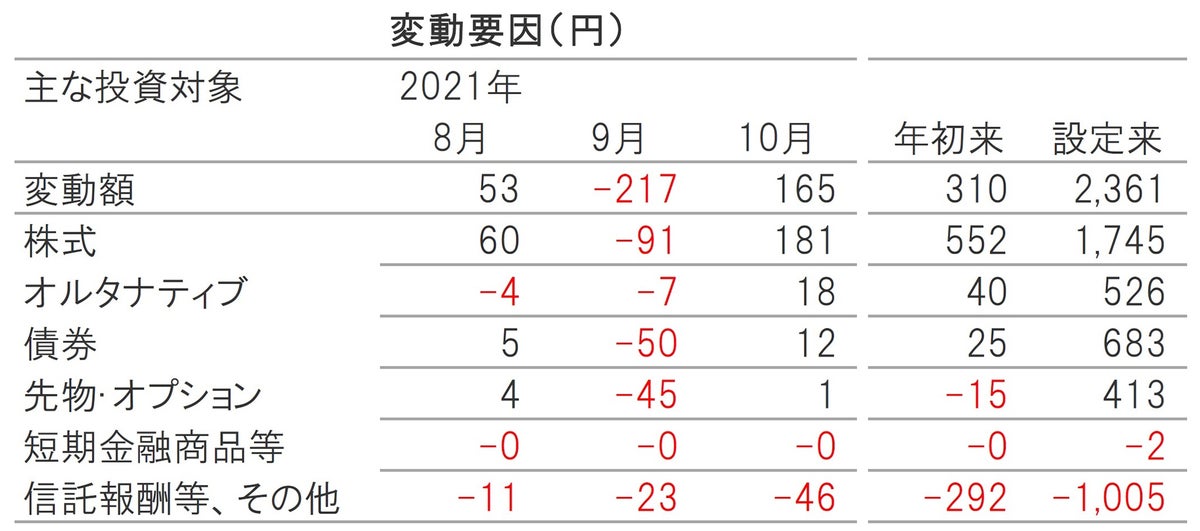 2021年10月の基準価額変動要因は、株式、オルタナティブ、債券、先物・オプションがいずれもプラス要因となりました。