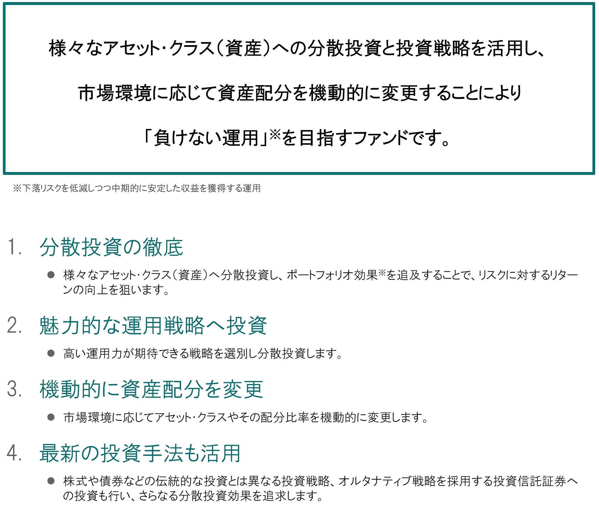 引き続き、当ファンドでは、様々なアセット・クラス(資産)への分散投資と投資戦略を活用し、市場環境に応じて資産配分を機動的に変更することにより「負けない運用(下落リスクを低減しつつ中期的に安定した収益を獲得する運用)」を目指してまいります。