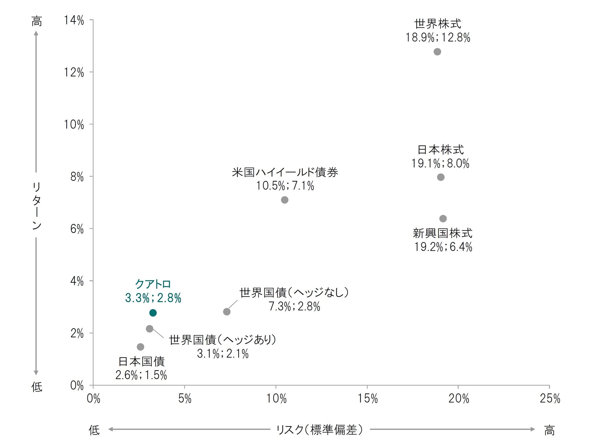 図表2:クアトロおよび主要な資産のリスク・リターン比較