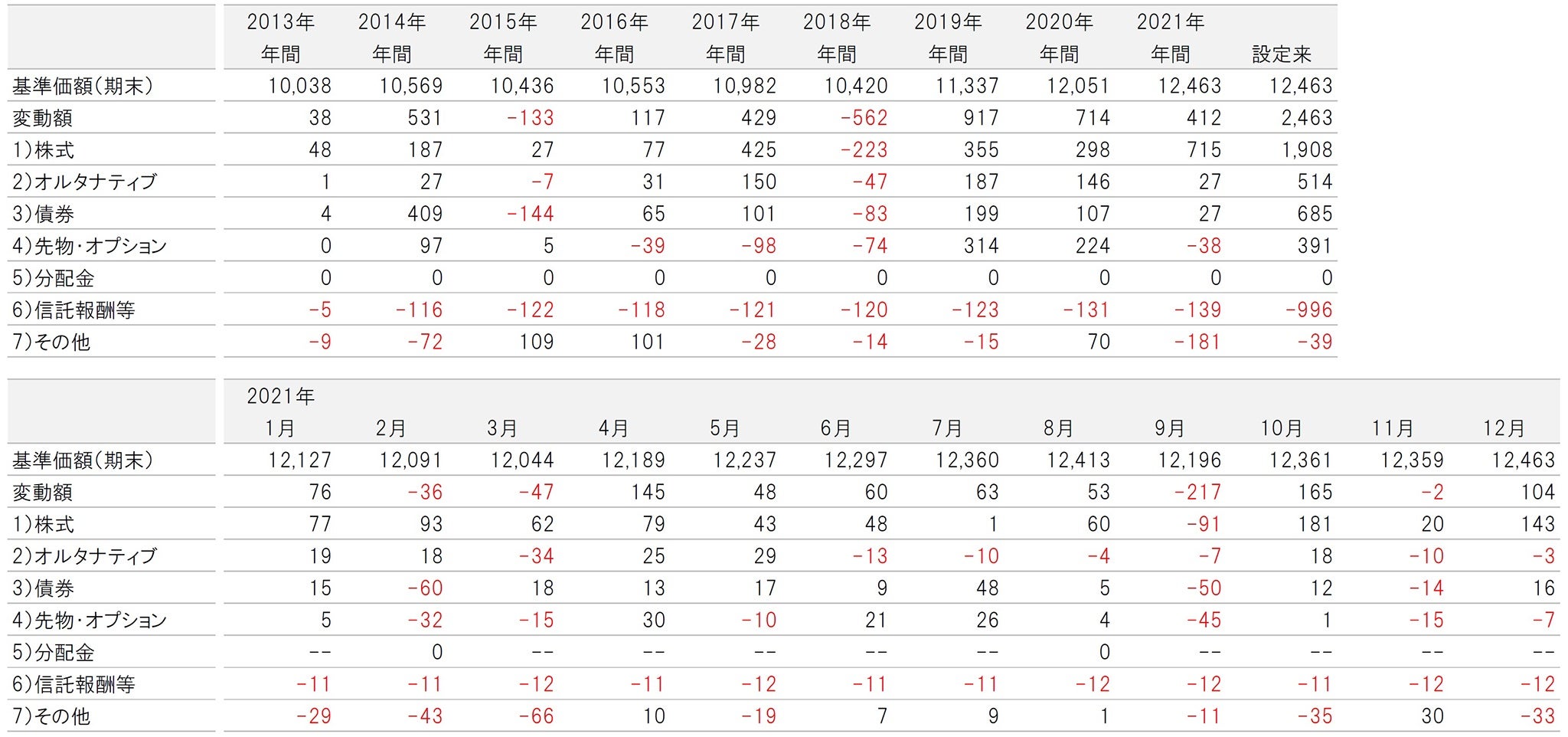 ※「2021年年間」の「基準価額(期末)」は2021年年末の基準価額を表します。また、「2021年年間」の「変動額」は2020年年末の基準価額に対して2021年年末の基準価額がどの程度変動したかを表します。なお、「2013年年間」の変動額については設定日(2013年12月12日)の基準価額に対して2013年年末の基準価額がどの程度変動したかを表します。設定来は2013年12月12日~2021年12月30日。