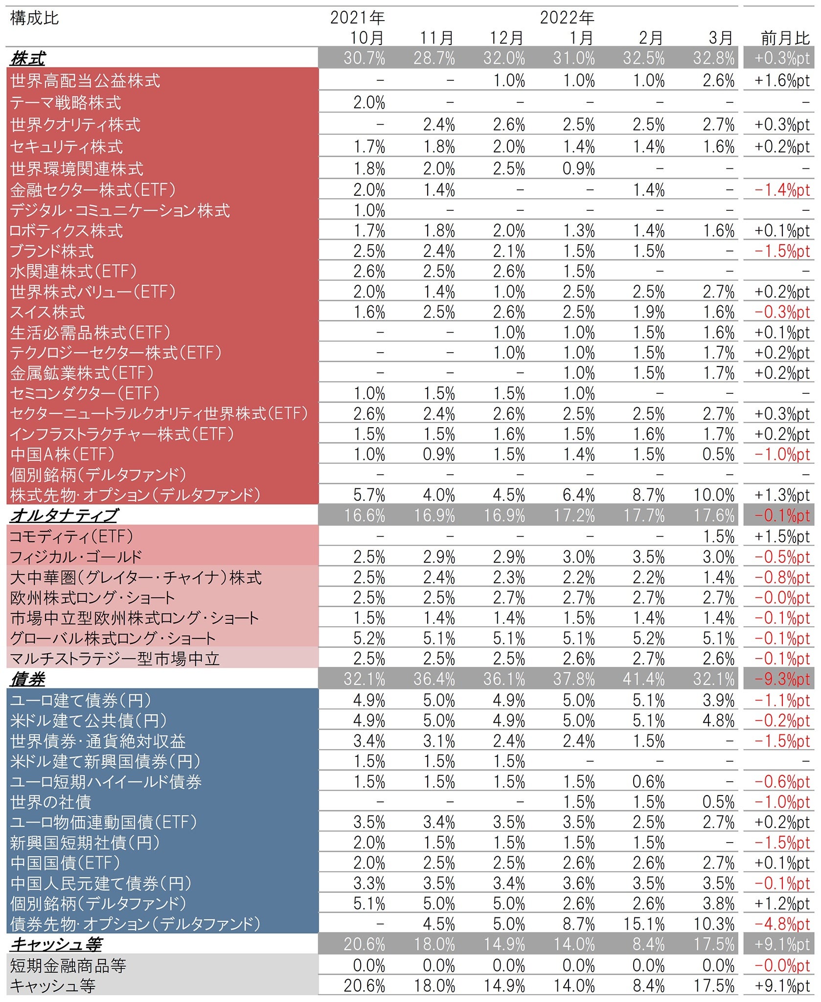 ※構成比は実質比率(マザーファンドの組入比率×マザーファンドにおける当該資産の組入比率)です。マザーファンドにおける当該資産の組入比率は、各投資先ファンドを主な投資対象によって株式、オルタナティブ、債券、短期金融商品等に分類、集計しています。構成比推移の債券と株式にはマザーファンドの投資先ファンドであるピクテ・デルタ・ファンドの株式先物、債券先物、オプションプレミアムを含めて集計しています。株式先物・オプション、債券先物・オプションにはピクテ・デルタ・ファンドの株式先物、債券先物、オプションプレミアムを含めて集計しています。キャッシュ等には投資先ファンドで保有する現金等の比率を含みません。
