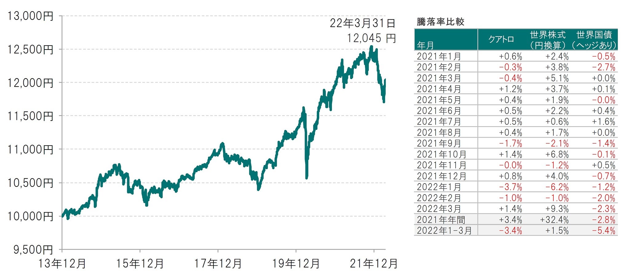 クアトロの2022年3月31日の基準価額は12,045円となり、年初来(2021年12月30日~2022年3月31日)で3.4%下落しました。2022年1-3月の月間騰落率は、1月が-3.7%、2月が-1.0%、3月が+1.4%となっています(図表1)。