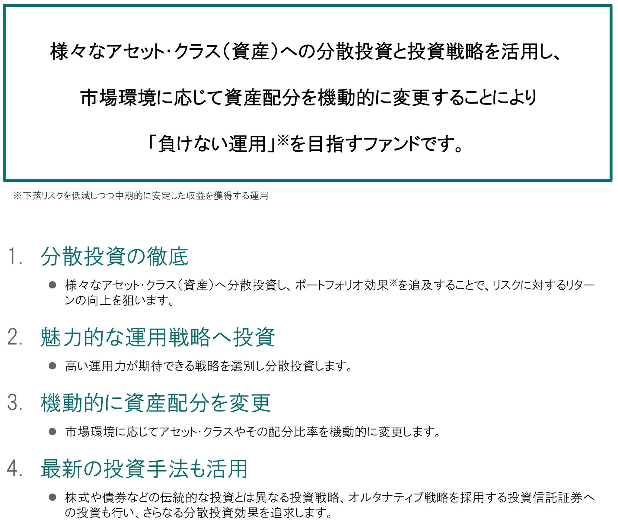 当ファンドでは、引き続き、様々なアセット・クラス(資産)への分散投資と投資戦略を活用し、市場環境に応じて資産配分を機動的に変更することにより「負けない運用(下落リスクを低減しつつ中期的に安定した収益を獲得する運用)」を目指してまいります。