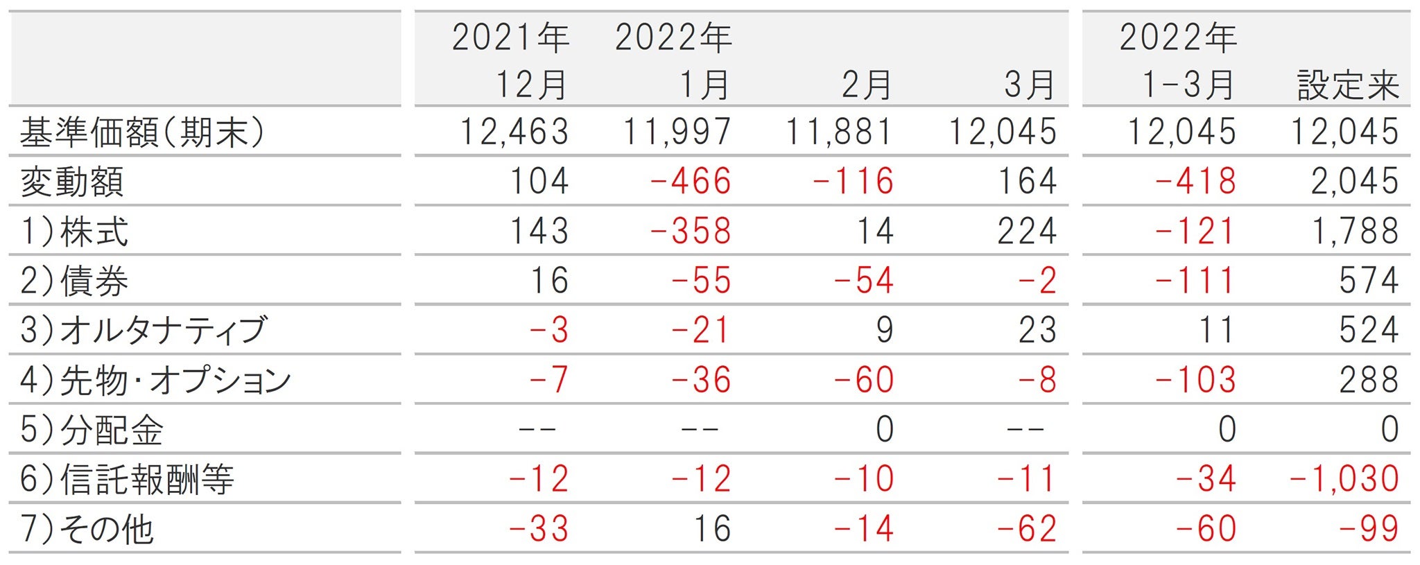 基準価額は、1月に米連邦準備制度理事会(FRB)が市場想定以上に積極的な金融引き締めに動くとの見方が強まったことなどから世界の株式市場、債券市場がともに下落した影響が大きく、年初来でのマイナスを解消するに至っていませんが、3月末にかけて主に株式がけん引してやや持ち直しています。