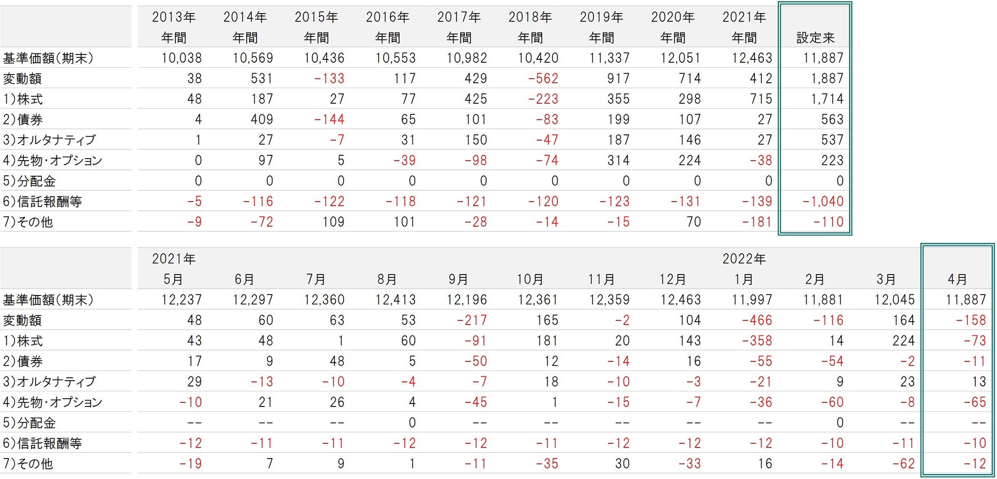 ※「2021年年間」の「基準価額(期末)」は2021年年末の基準価額を表します。また、「2021年年間」の「変動額」は2020年年末の基準価額に対して2021年年末の基準価額がどの程度変動したかを表します。なお、「2013年年間」の変動額については設定日(2013年12月12日)の基準価額に対して2013年年末の基準価額がどの程度変動したかを表します。設定来は2013年12月12日~2022年4月28日。