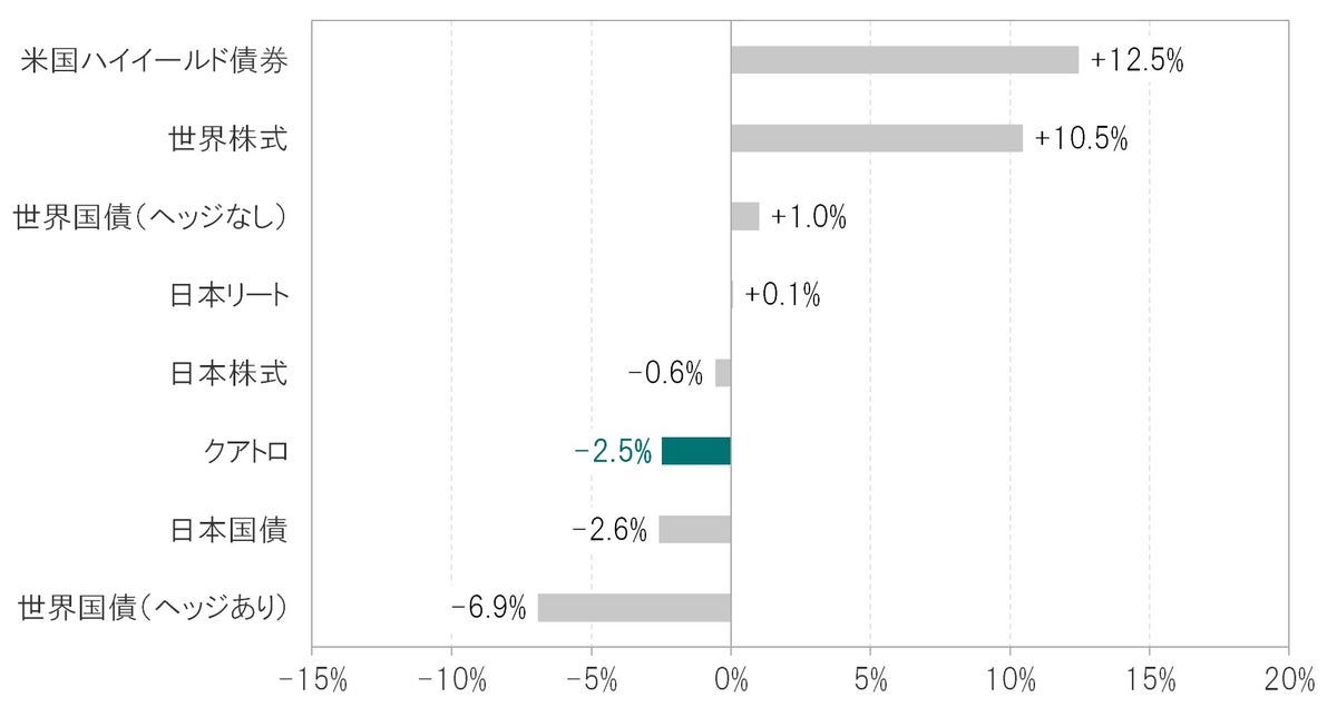 ※日本国債:FTSE日本国債指数、世界国債(ヘッジあり):FTSE世界国債指数(円ヘッジ)、世界国債(ヘッジなし):FTSE世界国債指数(円換算)、米国ハイイールド債券:ICE BofA米国ハイイールド債券指数(円換算)、世界株式:MSCI全世界株価指数(円換算)、日本株式:TOPIX、日本リート:東証REIT指数