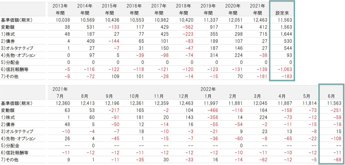 ※上段表の各年間の「基準価額(期末)」は各年末の基準価額を表します。また、各年間の「変動額」は前年末の基準価額に対して各年末の基準価額がどの程度変動したかを表します。なお、「2013年年間」の変動額については設定日(2013年12月12日)の基準価額に対して2013年年末の基準価額がどの程度変動したかを表します。設定来は2013年12月12日~2022年6月30日。